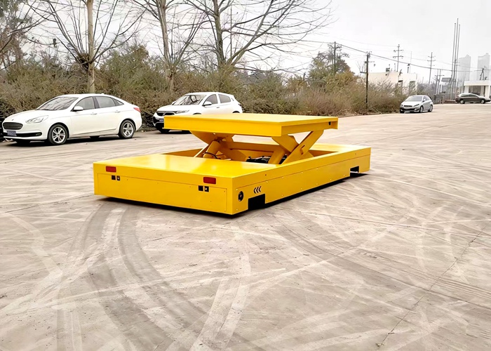 无轨剪叉升降平车是一种多功能起重装卸机械设备。通常可以在设定高度范围内自由升降,满足不同作业高度要求。平台可以整个台面进行升降,也可以另设工作台,升降时实现固定高度自动停止。电动平车常用的升降平台有两种,一种是垂直升降平台,由液压系统提供动力进行升降,根据承载吨位和升降高度,配置液压缸数量和规格不同,一种是剪叉式升降平台,也由液压系统提供动力。