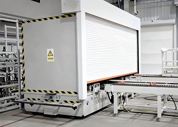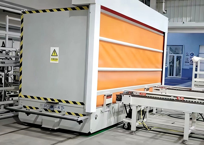 该车是带集装箱卷帘的RGV是专为室内与室外过跨转运自动化装卸与转运场景设计的高度专业化智能搬运设备。它将标准RGV的轨道运输能力与集装箱适配的卷帘式封闭台面相结合,实现了货物在集装箱内外环境中的无缝、高效、安全转运。