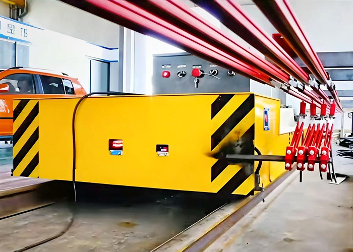 电缆线的位置可根据平车的使用现场的具体情况确定,可放置在地面,也可架设在空中。平车的操作系统由低压24V电源控制;平车台面上允许加装液压或机械升降系统V型架、滚轮架辊道、称重等装置;可实现自动化远程控制